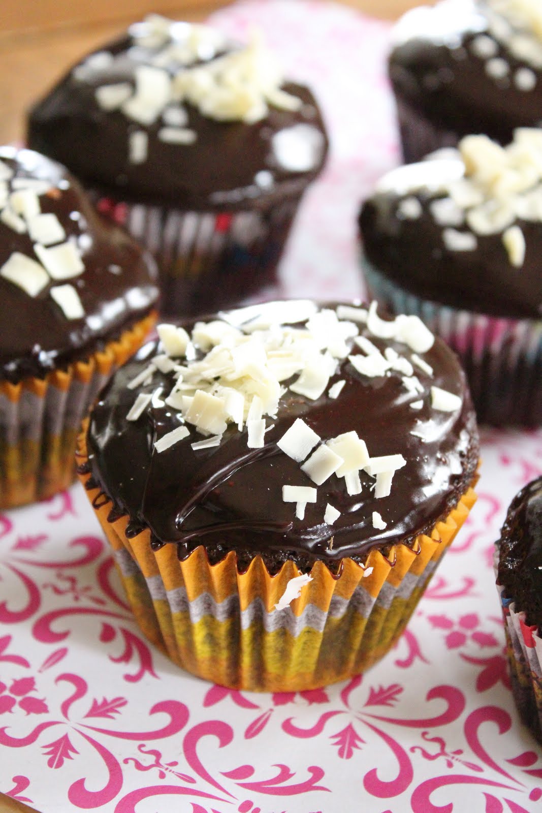 Dip each cupcake in the ganache. You can leave cupcakes as is or decorate using anything you desire. I decorated cupcakes with some white chocolate shavings using a potato peeler.