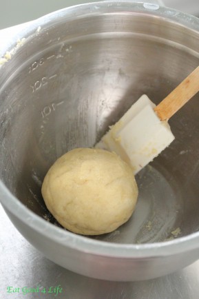 Here you can see how the dough looks like. Pat it down in between plastic paper with a spatula onto a 6 1/2 round cake pan with removable bottom and place in the freezer for 30 minutes to make it easier to handle.