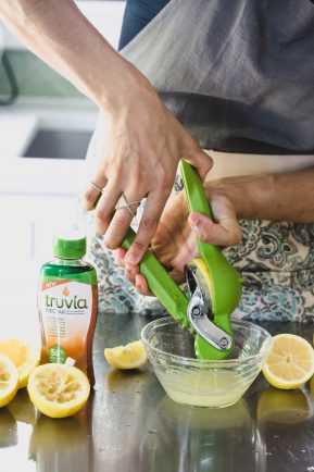 To obtain the lemon juice, with a lemon squeezer, squeeze the juice out of the lemons and place in a bowl. Add the Truvia Nectar and water and mix with a whisk.
