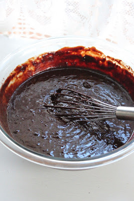 This is how the chocolate mixture looks like when mixing in all of the ingredients. Not that you can see very good but I thought it may help. The little chunks are the raisins.