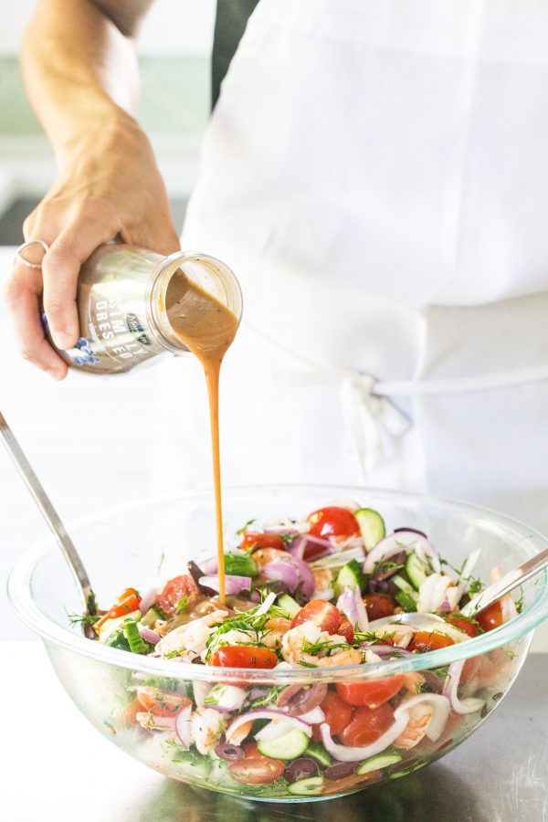 Their products can be found in stores near the classic dressings in the refrigerated produce section. You will be able to find a variety of flavors so make sure you use your favorite. This shrimp Mediterranean salad however goes great with the balsamic variety.
